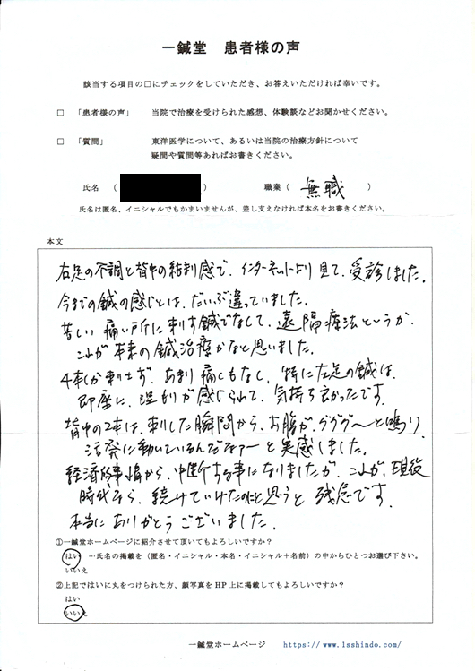 今までの鍼の感じとはだいぶ違っていました。 苦しい痛い所に刺す鍼でなくて、 遠隔療法というか、これが本来の鍼治療かなと思いました。 4本しか刺さず、あまり痛くもなく 特に左足の鍼は即座に温もりが感じられて気持ち良かったです。 背中の2本は刺した瞬間からお腹がグググ〜と鳴り、 活発に動いているんだなァーと実感しました。