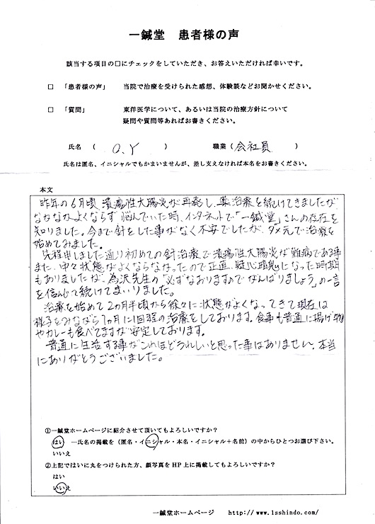 治療を始めて2ヶ月半頃から 徐々に状態がよくなってきて 現在は様子をみながら 1ヶ月に1回程の治療をしております。 食事も普通に揚げ物やカレーも食べてますが安定しております。 普通に生活する事がこれほどうれしいと思った事はありません。 本当にありがとうございました。