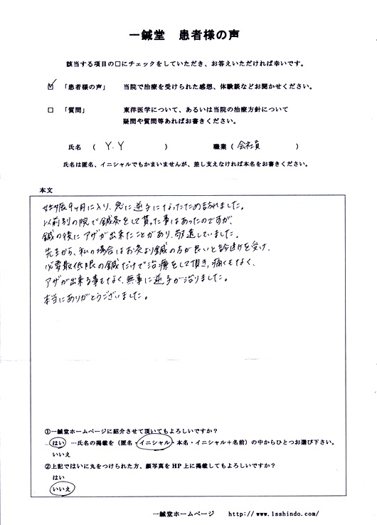 ------------------------------------------- 【体験談】 妊娠9ヶ月に入り、急に逆子になったため訪れました。以前 別の院で鍼灸をして貰った事があったのですが、鍼の後にアザが出来たことがあり、敬遠していました。先生から、私の場合はお灸より鍼の方が良いと診断を受け必要最低限の鍼だけで治療をして頂き、痛くもなく、アザが出来る事もなく、無事に逆子が治りました。本当にありがとうございました。 (本文ママ。) --------------------------------------------------