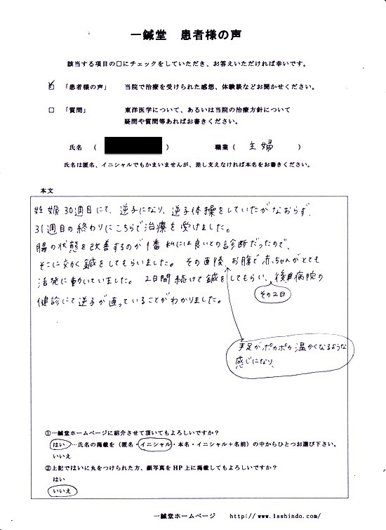 【体験談】 妊娠30週目にて、逆子になり、 逆子体操をしていたがなおらず、 31週目の終わりにこちらで治療を受けました。 腸の状態を改善するのが 1番私には良いとの診断だったので、 そこに効く鍼をしてもらいました。 その直後、手足がポカポカ温かくなるような感じになり、 お腹で赤ちゃんがとても活発に動いていました。 2日間続けて鍼をしてもらい、 その2日後病院の健診にて 逆子が直っていることがわかりました。