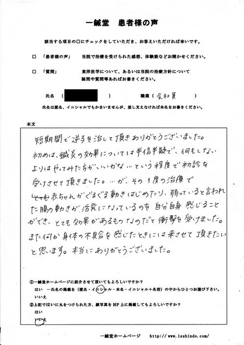 ------------------------------------------- 【体験談】 短期間で逆子を治して頂きありがとうございました。初めは、鍼灸の効果については半信半疑で、何もしないよりはやってみた方がいいかな…という程度で初診を受けさせて頂きました。…が、1度の治療で 赤ちゃんがぐるぐる動きはじめたり、弱っていると言われた腸の動きが、活発になっているのを自分自身感じることができ、とても効果があるものなのだと衝撃を受けました。また何か身体の不具合を感じたときには来させて頂きたいと思います。本当にありがとうございました。 (本文ママ。) --------------------------------------------------