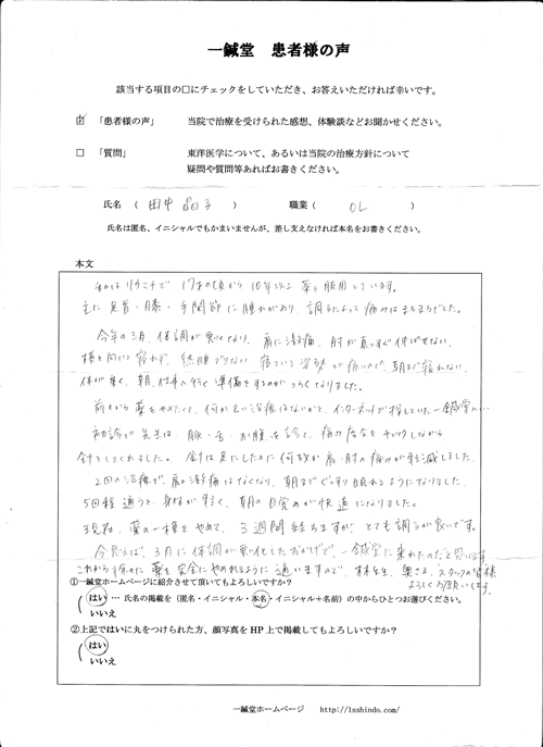 主訴: リウマチ ------------------------------------------- 私はリウマチで17才の頃から 今年の3月頃、体調が悪くなり、 初診で先生は脈・舌・お腹を診て、 5回程通うと、身体が軽く、 今思えば、3月に体調が悪化したおかげで、
