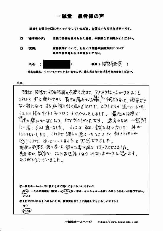 【体験談】 2月末に、医院で、抗生物質の点滴を受けて、アナフィラキシーショックをおこし、それからずっと疲れやすく、背中の痛みがありました。 4月末になって、我慢できない程になって、また病院に行く気にもなれず、どうしようか迷っている時、こちらのHPのサイトをみつけてすぐメールをしました。 最初の治療で背中の痛みがなくなり、すごくうれしかったです。 遠方のため、一週間に一度、6回通いました。小さな細い鍼を打つだけで、体がほかほかしたり、これまで調子の悪かったところが動き出すのが感じられて、治っていってるんだと実感できました。 施術の部屋で、落ち着いた静かな雰囲気でリラックスできました。 先生方が誠実で、ここにお世話になり、本当によかったと思います。 ありがとうとざいました。