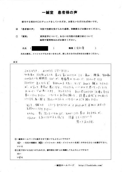 主訴: 首の痛み(頚痛)、肩凝り