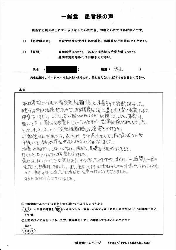 耳鳴り…大阪府豊中市の匿名希望様の鍼灸治療体験談