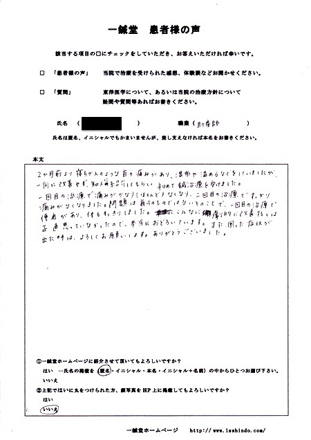 落沈(寝違い)…大阪府吹田市の匿名希望様の鍼灸治療体験談