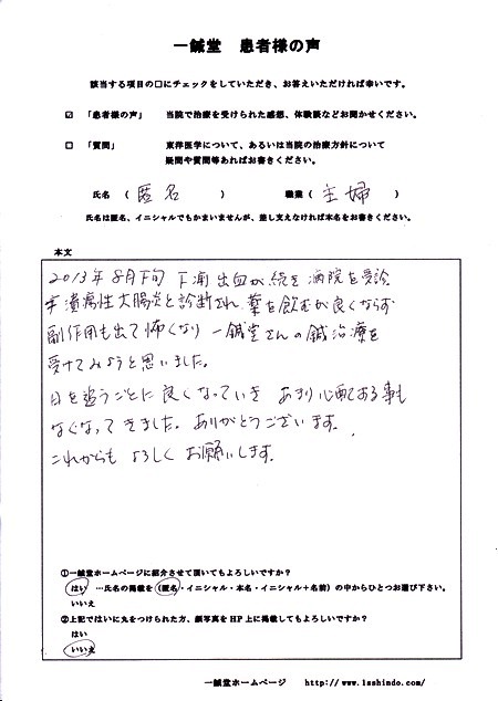 ------------------------------------------- 【体験談】 2013年8月下旬、下痢出血が続き病院を受診。潰瘍性大腸炎と診断され、薬を飲むが良くならず副作用も出て怖くなり一鍼堂さんの鍼治療を受けてみようと思いました。日を追うごとに良くなっていきあまり心配する事もなくなってきました。ありがとうございます。これからもよろしくお願いします。 (本文ママ。) --------------------------------------------------