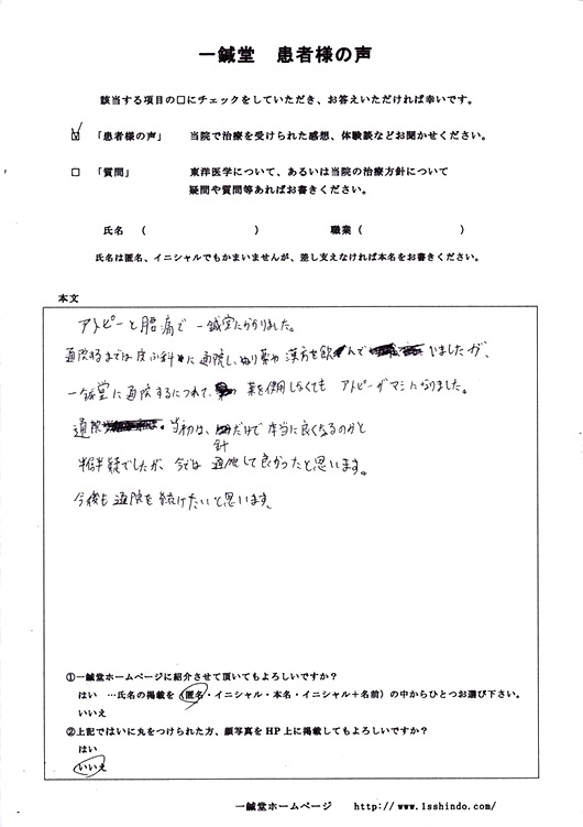 ------------------------------------------- 【体験談】 アトピーと腰痛で一鍼堂にかかりました。通院するまでは皮ふ科に通院し、ぬり薬や漢方を飲んでいましたが、一鍼堂に通院するにつれて、薬を服用しなくてもアトピーがマシになりました。通院当初は、針だけで本当に良くなるのかと半信半疑でしたが、今では通院して良かったと思います。今後も通院を続けたいと思います。 (本文ママ。) --------------------------------------------------