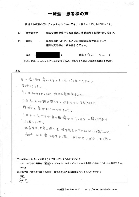 ------------------------------------------- 【体験談】 肩が痛くなり、着がえをするのも、つらくなってきたので来院しました。針は初めてでしたが、院内の雰囲気もよく、先生もゆっくり話を聞いてくださるので、リラックスして施術を受けることができました。1回目の施術で肩の痛みもなくなり、お腹の調子もよくなりました。仕事中も、日常生活でも痛みを気にすることがなくなったので心も楽になりました。ありがとうございました。 (本文ママ。) --------------------------------------------------