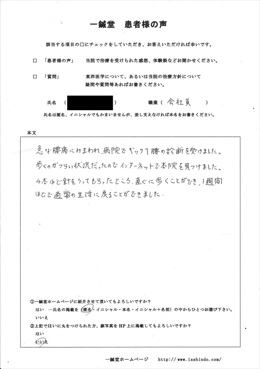 ------------------------------------------- 【体験談】 急な腰痛にみまわれ、病院でギックリ腰の診断を受けました。歩くのがつらい状況だったのでインターネットで本院を見つけました。4本ほど針をうってもらったところ、直ぐに歩くことができ、1週間ほどで通常の生活に戻ることができました。 (本文ママ。) --------------------------------------------------