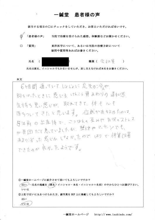 ------------------------------------------- 【体験談】 6ヶ月間通っていて、じょじょに足先の冷えや胸をはったときに感じるけんこう骨まわりの違和感、気持ち悪い感じ取れてきて、体も心も落ちついてきたと思います。症状が出始めたのは、8年前の出産後で、こつばんの歪みや育児のストレスが原因だと思っていましたが、整体やマッサージでもあまり治った感じがしなかったので、はりで体質改善できたのが良かったようです。 (本文ママ。) --------------------------------------------------