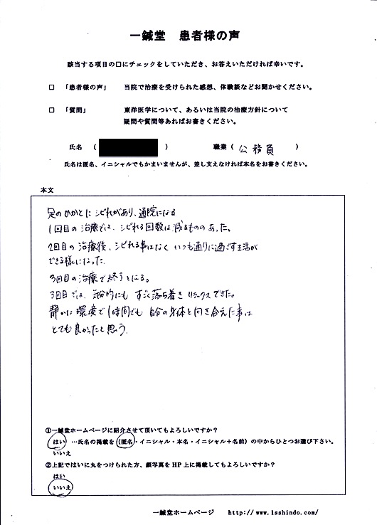 ------------------------------------------- 【体験談】 足のかかとにシビれがあり、通院になる。1回目の治療では、シビれる回数は減るもののあった。2回目の治療後、シビれる事はなくいつも通りに過ごす生活ができる様になった。3回目の治療で終了となる。3回目では、気分的にもすごく落ち着きリラックスできた。静かな環境で1時間でも自分の身体と向き合えた事はとても良かったと思う。 (本文ママ。) --------------------------------------------------