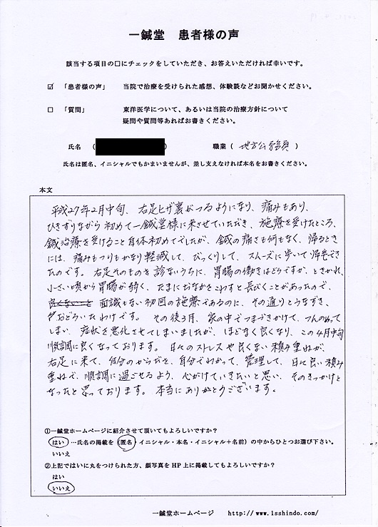 日々のストレスや良くない積み重ねなが 右足に来て、自分のからだを自分でわかって、管理して、 日々良い積み重ねで順調に過ごせるよう心がけていきたいと思い、 そのきっかけとなったと思っております。 本当にありがとうございます。