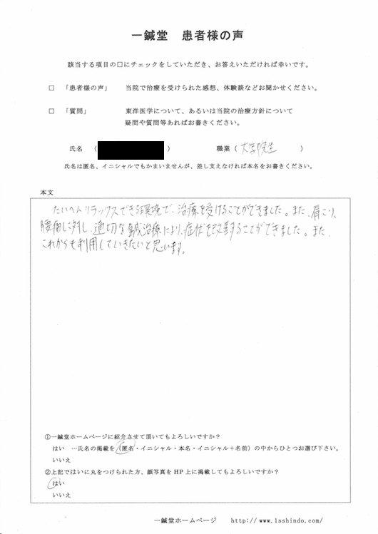 【担当鍼灸師(宮村)より】 こちらに来られた当時は公私ともに大変忙しい中で御体の状態だけでなく精神的にも大変な時期でしたが根気よくに通って頂き順調に回復することが出来ました。ただ負担もまだ多いので今後も定期的に御体を診させて頂ければと思います。 宮村