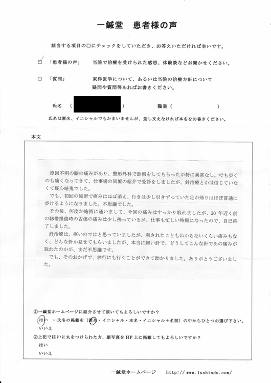 膝の痛み…兵庫県加古川市の匿名希望様の鍼灸治療体験談