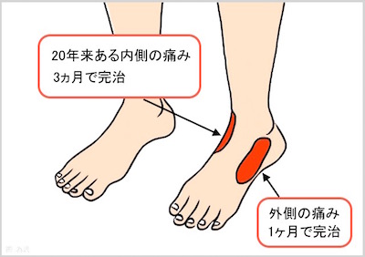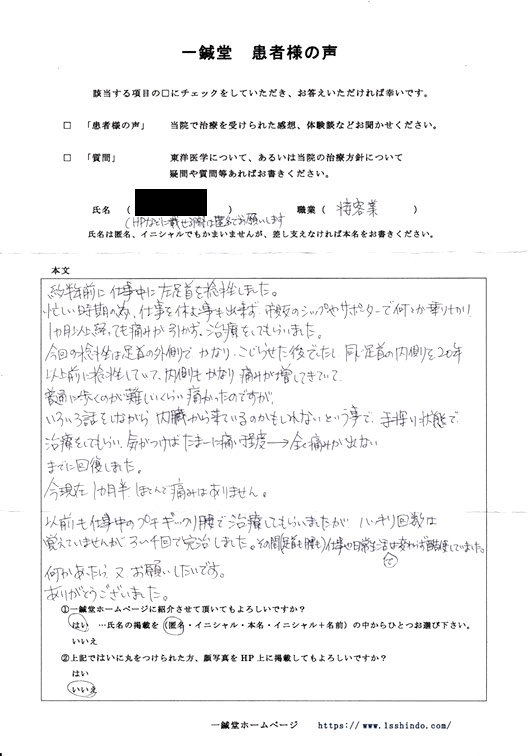 約半年前に仕事中に左足首を捻挫しました。 忙しい時期の為、仕事を休む事も出来ず、 市販のシップやサポーターで何とか乗り切り、 1ヵ月以上経っても痛みが引かず、治療をしてもらいました。 今回の捻挫は足首の外側で、かなりこじらせた後でしたし、 同じ足首の内側を20年以上前に捻挫していて、 内側もかなり痛みが増してきていて、 普通に歩くのが難しいくらい痛かったのですが いろいろ試しながら、内臓から来ているのかもしれない という事で、手探り状態で治療をしてもらい、気がつけば たまーに痛い程度 → 全く痛みが出ない まで回復しました。 今現在1ヵ月半、ほとんど痛みはありません。 以前も仕事中のプチギックリ腰で治療してもらいましたが、 ハッキリ回数は覚えていませんが3~4回で完治しました。 その間(足首も腰も)仕事や日常生活では 変わらず酷使していました。 何かあったら又お願いします。ありがとうございました。