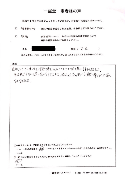 ------------------------------------------- 【体験談】 最初、ひざが痛くなり、階段を降りるのがきつくてこの店を親に言われて来ました。多分治らないと思いながらうけてみて、終わった次の日から階段を降りるのが痛くなくなりました。(本文ママ。) --------------------------------------------------
