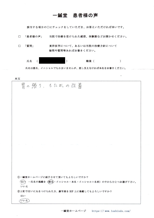 【担当鍼灸師(新川)より】シンプルな内容で綴って頂きました笑症状としては、胃の状態以外にも、呼吸がしにくい、頻尿などの症状も対応致しました。年末にご家族の集まりがありお忙しくされておりましたが無事に乗り切れたことがご本人にとっても自信になったと思われます。体験談ありがとうございました!(2017年 3月 14日)