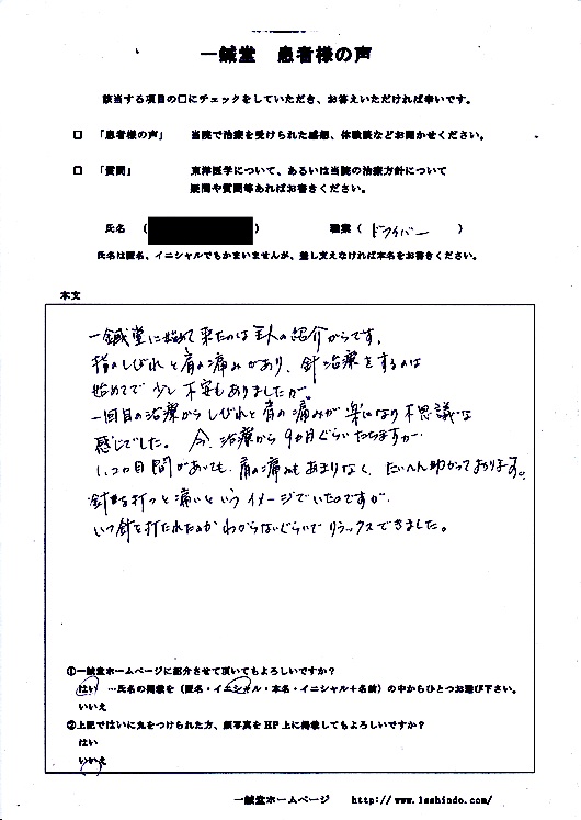 ------------------------------------------- 【体験談】 一鍼堂に始めて来たのは主人の紹介からです。指のしびれと肩の痛みがあり、鍼治療をするのは始めてで少し不安もありましたが一回目の治療からしびれと肩の痛みが楽になり不思議な感じでした。今治療から9ヶ月ぐらいたちますが、1、2ヶ月 間があいても肩の痛みもあまりなく、大変助かっております。針を打つと痛いというイメージでいたのですが、いつ針を打たれたのかわからないぐらいでリラックスできました。 (本文ママ。) --------------------------------------------------