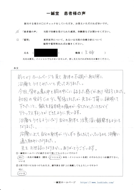 ------------------------------------------- 【体験談】 前々よりホームページを見て、身体の不調がある際に治療をうけてみたいと思っておりました。今回、背中の真ん中と胸の中心に詰まった感じがあり受診しました。初回の受診では少し緊張しましたが先生が丁寧に説明して下さったこと鍼を指す時の痛みが全くなかったことなどでリラックスすることができたように思います。治療を受けるようになり自分の身体も注意深く観察するようにもなりました。治療によって自分の身体が少しずつ良くなっているのも治療に通う励みになりました。先生お世話になりました。ありがとうございます。(本文ママ。) --------------------------------------------------