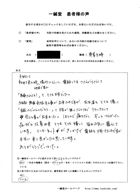 ------------------------------------------- 【体験談】 予約して初めて来た時地図で見た場所にないし、電話してもつながらなくて「騙されてる?」と、とても不安でした。結局無事来院する事が出来たのですが、先生達もとても優しく「鍼はどんなんだろう…」と不安が無くなるまでリラックスして受ける事が出来ました。ほとんど痛みなく、ずっとつらかった症状も改善出来とてもとても嬉しく毎日元気に暮らしています。インターネットがきっかけで電話を掛けたのですが、本当に来て良かったと思っています。ありがとうございました。 (本文ママ。) --------------------------------------------------
