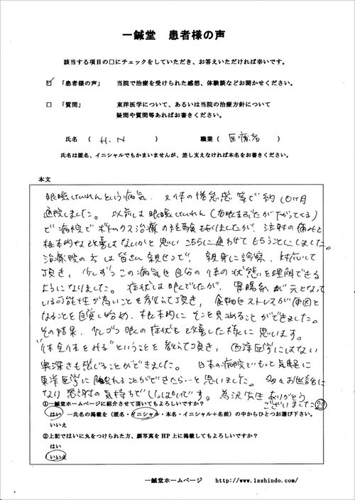 兵庫県川辺郡のH.N様の鍼灸治療体験談