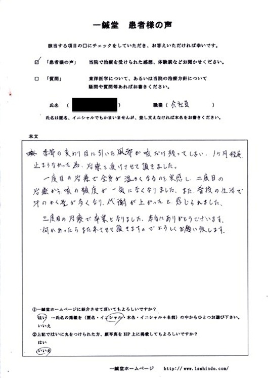 ------------------------------------------- 【体験談】 季節の変わり目に引いた風邪が咳だけ残ってしまい、1ヶ月程度止まらなかった為、治療を受けさせて頂きました。一度目の治療で全身が温かくなるのを実感し、二度目の治療から咳の頻度が一気になくなりました。また、普段の生活で汗のかく量が多くなり代謝が上がったと感じられました。三度目の治療で卒業となりました。本当にありがとうございます。何かあったらまた来させて頂きますのでよろしくお願い致します。 (本文ママ。) --------------------------------------------------