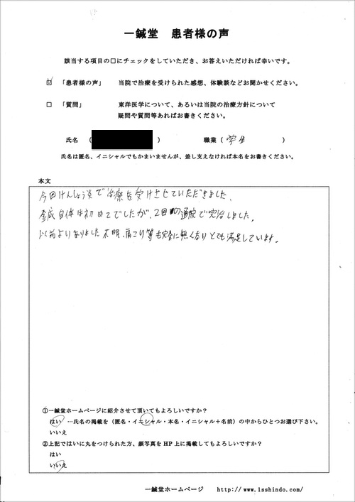 ------------------------------------------ 【体験談】 今回けんしょう炎で治療を受けさせていただきました。鍼自体は初めてでしたが、2回の通院で完治しました。以前よりありました不眠、肩こり等も完全に無くなりとても満足しています。 (本文ママ。) --------------------------------------------------