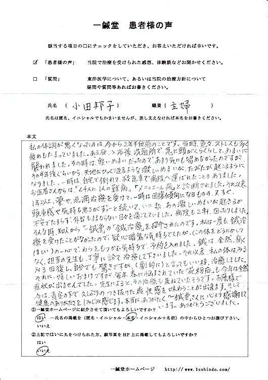 兵庫県姫路市の小田邦子様の鍼灸治療体験談