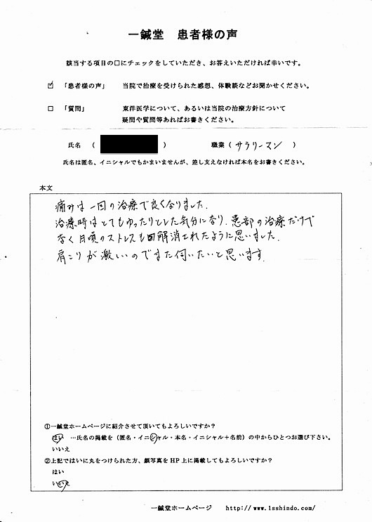------------------------------------------ 【体験談】 痛みは一回の治療で良くなりました。治療時はとてもゆっくりとした気分になり、患部の治療だけでなく日頃のストレスも解消されたように思いました。肩こりが激しいのでまた伺いたいと思います。(本文ママ。)ーーーーーーーーーーーーーーーーーーーーーーーーーーーーーーーーーー