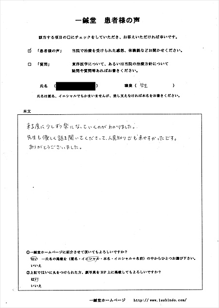 【担当鍼灸師(新川)より】 試験を間近に控えた年明けから御体診させて頂きました。緊張すると頭痛が出やすい状態でしたが、試験当日は症状なく受けられたとのことです。M.Kさんへ春からの新生活楽しんで下さいね。友人とのお付き合いも多くなると思いますが、うどん、ラーメンなどの麺類の過食は要注意ですよ。体験談ありがとうございました!