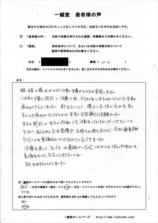 ------------------------------------------- 【体験談】 腕、手首の痛みがひどく、仕事に支障がでるため来院しました。1回目で丁寧な問診と治療の後、ぞうきんをしぼるのもつらかった手首の痛みがきえていました。針をうつことで、滞っていた体の流れを良くすることで痛みがなくなるのは、本当に不思議な体験でした。先生の問診で自分の内側にも注意をしなければいけないことを知り、あらためて生活習慣や、気持ちの持ち方など、今まで無意識だったことを意識することの大切さに気づきました。治療を通して、気づきの連続でしたが、これからも体の内側にも意識をむけて生活してゆきたいです。先生お世話になりました。 (本文ママ。) --------------------------------------------------