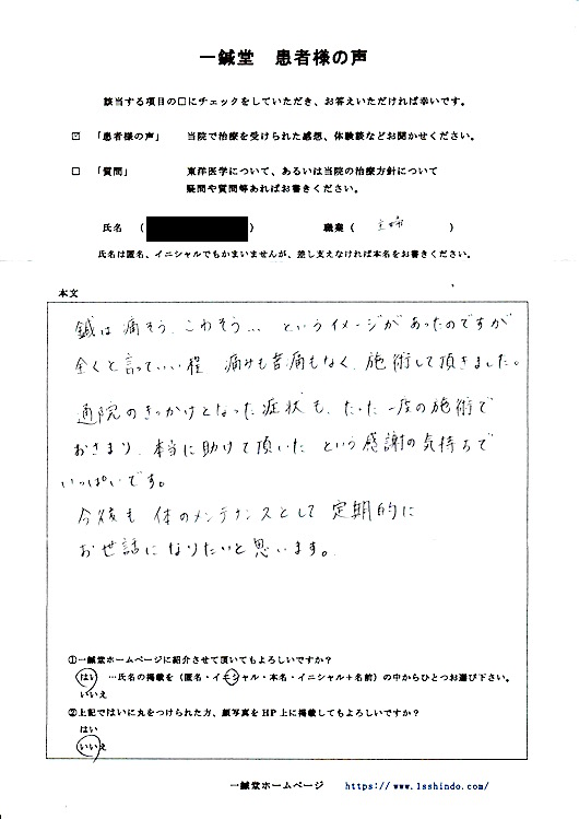 -------------------------------------------【体験談】 鍼は痛そう、こわそう・・・というイメージがあったのですが全くと言っていい程、痛みも苦痛もなく、施術して頂きました。通院のきっかけとなった症状もたった一度の施術でおさまり本当に助けて頂いた という感謝の気持ちでいっぱいです。今後も体のメンテナンスとして定期的にお世話になりたいと思います。(本文ママ。) --------------------------------------------------