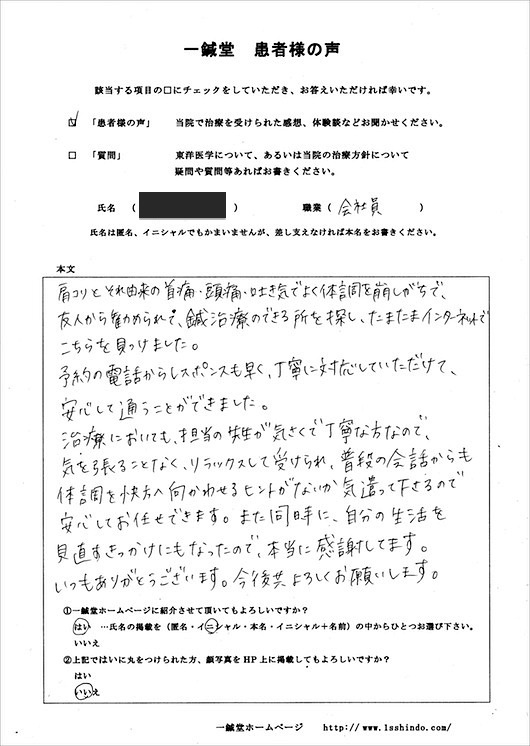 大阪市淀川区のM.O様の鍼灸治療体験談