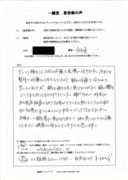 大阪府吹田市のNOBUHIKO.N様の鍼灸治療体験談