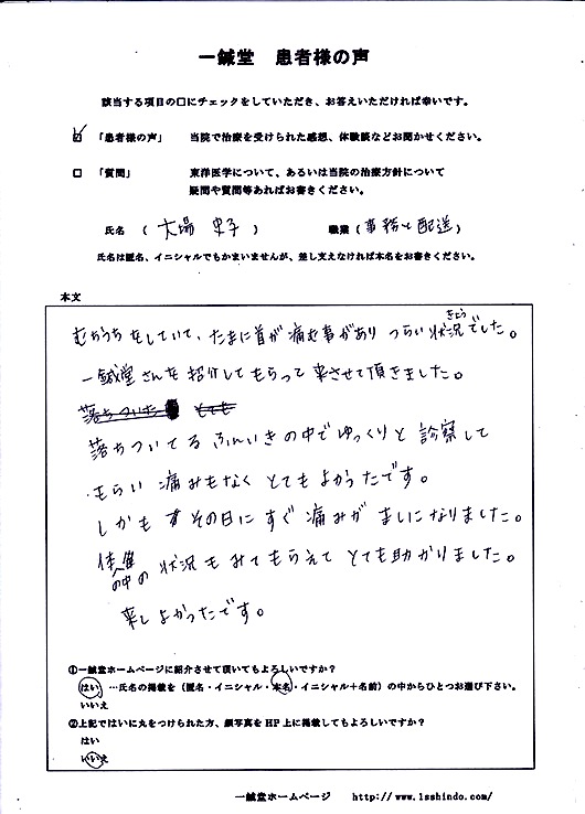 大阪市此花区の大場 史子様の鍼灸治療体験談