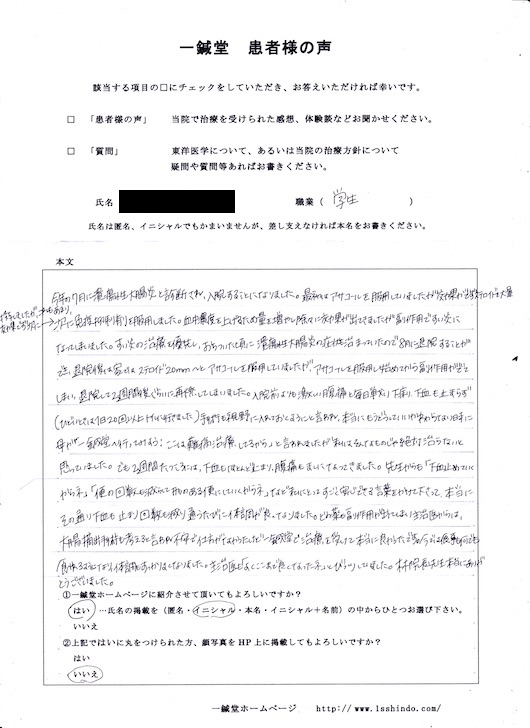【体験談】 今年の7月に潰瘍性大腸炎と診断され、 入院することになりました。 最初はアサコールを服用していましたが効果がでず ステロイドを大量投与しましたが、 これもあまり効果がでず、 次に免疫抑制剤を服用しました。 血中濃度を上げるため量を増やし徐々に効果が出てきましたが 副作用ですい炎になってしまいました。 すい炎の治療を優先し、 おちついた頃に潰瘍性大腸炎の症状も治まっていたので 8月に退院することができ、 退院後は家ではステロイド20㎜とアサコールを服用していましたが、 アサコールを服用し始めてから副作用がでてしまい、 退院して2週間後ぐらいに再燃してしまいました。 入院前よりも激しい腹痛と毎日戦い下痢、 下血も止まらず(ひどいときは1日20回以上トイレにいきました) 手術も視野に入れておくようにと言われ、 本当にもうどうしていいかわからない時に母が 「一鍼堂へ行ってみよう。ここは難病治療してるから」 と言われましたが私はそんなものじゃ絶対治らないと思っていました。 でも2週間たつころには、下血もほとんど止まり、 腹痛もましになってきました。 先生からも 「下血を止めていくからね」 「便の回数も減らしていくからね」 など私にとってすごく安心できる言葉をかけて下さって、 本当にその通り下血も止まり 回数も減り通うたびに体調が良くなりました。 どの薬も副作用が出てしまい主治医からは、 大腸摘出手術も考えると言われ不安で仕方がなかったけど、 一鍼堂で治療を受けて本当に良かったです。 今では食事も何でも食べれるようになり、 体調もすっかりよくなりました。 主治医も「よくここまでよくなったね」とびっくりしていました。 林院長先生本当にありがとうございました。