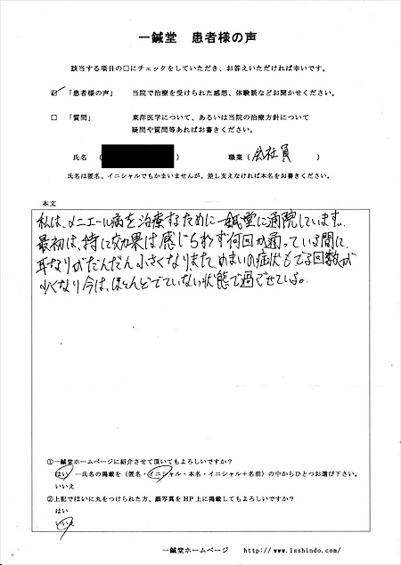 【体験談】 私はメニエール病を治療するために一鍼堂に通院しています。 最初は、特に効果は感じられず何回か通っている間に、 耳鳴りがだんだん小さくなりました。 めまいの症状も出る回数が少くなり 今は、ほとんど出ていない状態で過ごせている。