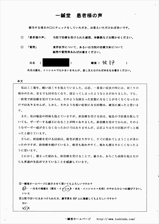 【体験談】 私はここ数年、 酷い肩こりを抱えていました。 以前、一番重い症状の時には、 肩こりの痛みのため、首までも回せなくなり、 固まってしまったようなときがありました。 でも、一鍼堂で鍼治療を受けてからは、 そのような固まった状態になることが、 全くなくなったわけではありませんが、 しかし、そのような重い症状になる回数は、 確実に減ったと思います。 また、私は喘息の持病を抱えていますが、 鍼治療を受ける前は、 喘息の予防薬を飲んでいても、 ゼーゼーする感じになることが時々ありました。 鍼治療を受けてからは、 そのようなゼーゼー感が全くなくなったわけではありませんが、 以前よりはその回数がずっと減ったと感じています。 さらに、鍼治療を受ける以前は、疲労が溜まりやすく、 すぐに疲れてしまうことが多かったのですが、 鍼治療を受けていると、疲労も取れやすく、 疲れも溜まりにくくなったように思います。 とにかく、溜まった疲れも鍼治療を受けることで、 癒され、あちこち故障を抱えながらも 普通の生活ができていることを感謝しています。