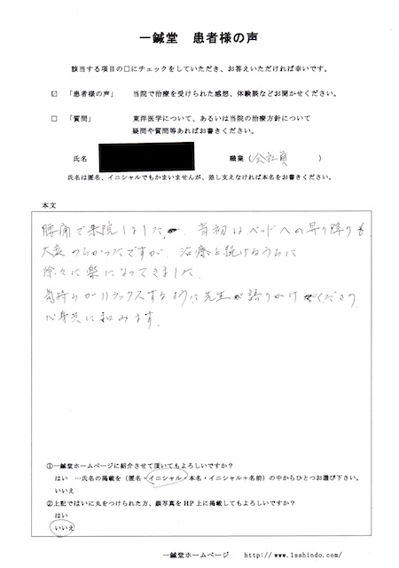 【担当鍼灸師(為沢)より】 2009年に卒腰痛をし、当院の施術で改善されましたが3年ぶりに痛みを再発され、今回再び診させて頂きました。最近は事務と営業での仕事で気が張っていると仰られておりましたね。今回の痛みも気滞からくるものであったので、施術中はなるべく気が張るような話は逸らし、その間に鍼で気滞を散らすよう施術致しました。心身共に和んで頂けたようで良かったです。お義母さんの介護などもあり、自由な時間があまりないですが息抜きする時間は大事なので作って下さいね。為沢