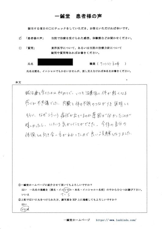 ------------------------------------------- 【体験談】 鍼治療を受けたのは初めてで、いつも治療後に体が軽くなる感じが不思議でした。内臓と体の不調のつながりを説明してもらい、なぜこういう症状が出ているのか分かったことが嬉しかったし、いろいろ気づくことができた。 今後の自分の体調との向き合い方が分かったので良い経験となりました。 (本文ママ。) --------------------------------------------------
