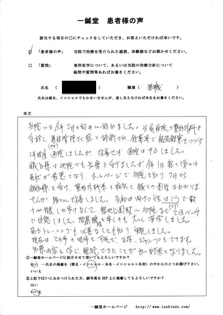 腰椎脊柱管狭窄症…大阪市住吉区のT.I様の鍼灸治療体験談