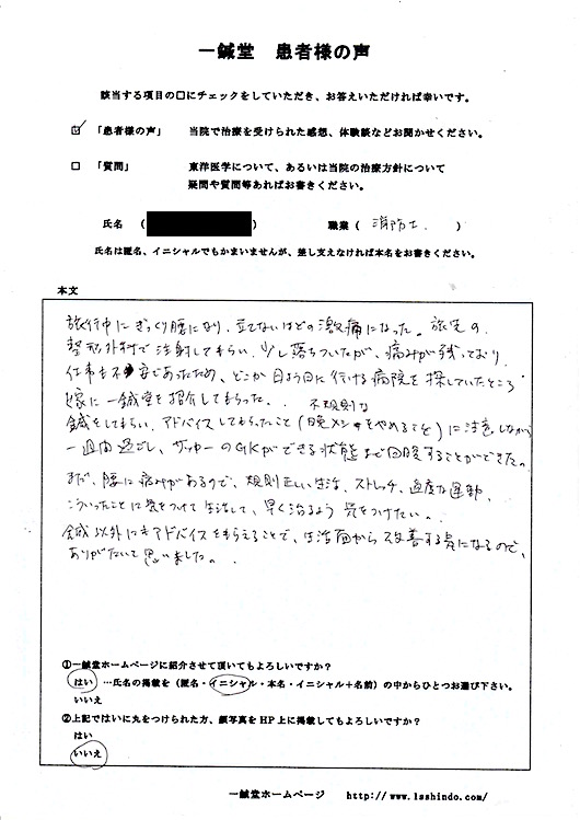 ------------------------------------------- 【体験談】 旅行中にぎっくり腰になり、立てないほどの激痛になった。旅先の整形外科で注射してもらい、少し落ち着いたが、痛みが残っており仕事も不安であったため、どこか日よう日に行ける病院を探していたところ嫁に一鍼堂を紹介してもらった。鍼をしてもらい、アドバイスしてもらったこと(不規則な晩メシをやめること)に注意しながら一週間過ごし、サッカーのGKができる状態まで回復することができた。まだ腰に痛みがあるので、規則正しい生活、ストレッチ、適度な運動、こういったことに気をつけて生活して早く治るよう気をつけたい。鍼以外にもアドバイスをもらえることで、生活面から改善する気になるので、ありがたいと思いました。(本文ママ。) --------------------------------------------------