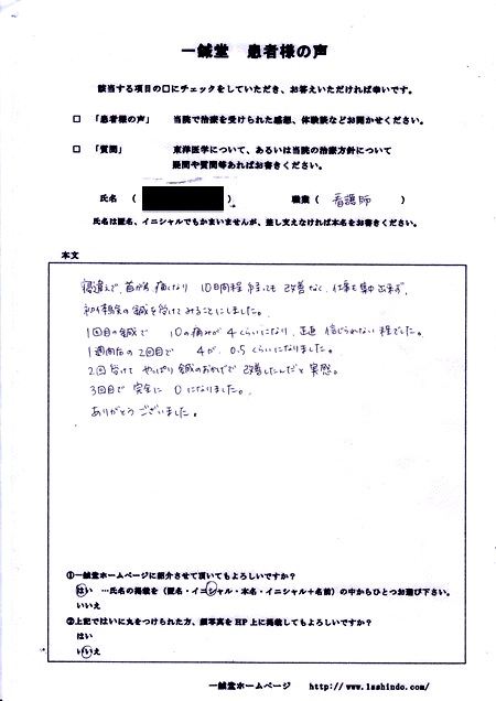 ------------------------------------------- 【体験談】 寝違いで首が痛くなり、10日間程経っても改善なく、仕事も集中出来ず、初体験の鍼を受けてみることにしました。1回目の鍼で10の痛みが4くらいになり、正直信じられない程でした。1週間後の2回目で4が0.5くらいになりました。2回受けてやっぱり鍼のおかげで改善したんだと実感。3回目で完全に0になりました。ありがとうございました。 (本文ママ。) --------------------------------------------------