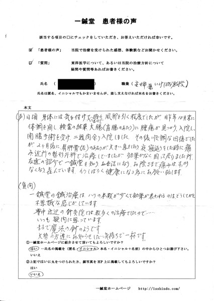その後、順調な回復でしたが、 2ヵ月後の、肩甲骨(左)のあたりが、 大きい息をしたり、夜、寝返りをした時に痛み、 近所の整形外科で治療していましたが、 効果がなく困って居りました所、 友達の紹介で一鍼堂を知り、お世話になり、 お陰さまで痛みはすっかりなくなり、㐂んでいます。 もうしばらく健康になる為にお願い致します。