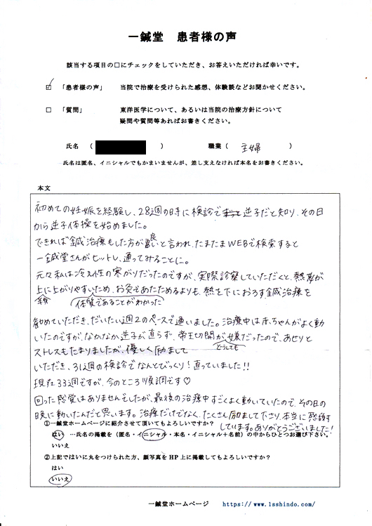 現在33週ですが、今のところ順調です♡ 回った感覚はありませんでしたが、 最後の治療中すごくよく動いていたので、 その日の晩に動いたんだと思います。 治療だけでなく、たくさん励まして下さり、 本当に感謝しています。 ありがとうございました!