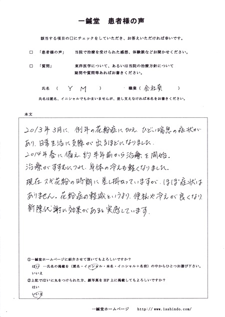 【担当鍼灸師(為沢)より】 Y.M様の場合、春になると木気が昂ぶることで花粉症、喘息が発症するものと診立て施術しました。現在は花粉症、喘息共に出ておらず よく落ち着いてます。便秘や冷え性も同時に改善したのも、五臓六腑の働きがよく噛み合ってきた証拠なので、花粉症、喘息が出ずに春を乗り越えれそうです。おめでとうございます☆為沢