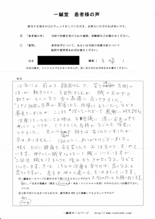 顔面の麻痺…大阪府東大阪市のM.Y様の鍼灸治療体験談