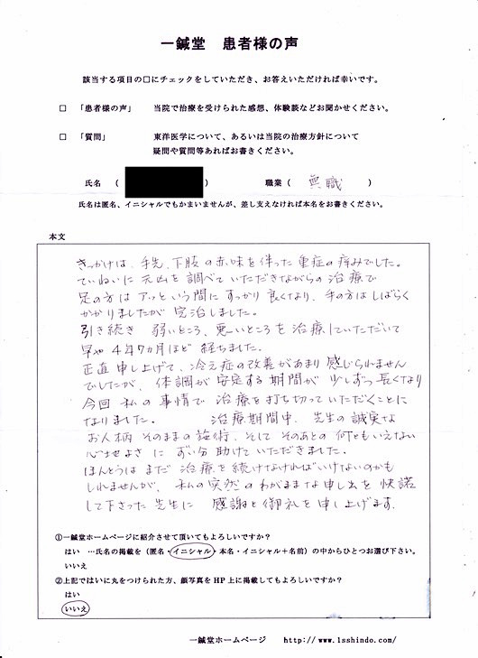 手足の湿疹…大阪府箕面市のY.O様の鍼灸治療体験談
