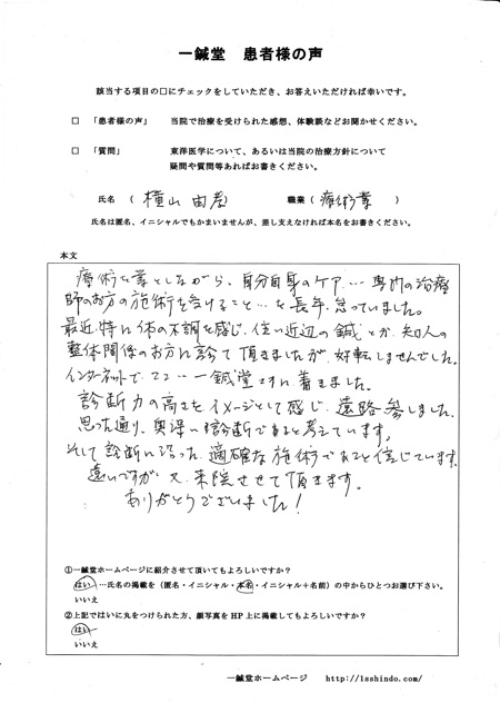 ------------------------------------------- 【体験談】 療術を業としながら、自分自身のケア…専門師のお方の施術を受けること…を長年怠っていました。最近、特に体の不調を感じ、住い近辺の鍼とか、知人の整体関係のお方に診て頂きましたが好転しませんでした。‥ここ…一鍼堂さまに着きました。診断力の高さをイメージとして感じ、遠路参しました。思った通り、奥深い診断であると考えています。そして診断に沿った、適確な施術であると信じています。遠いですが又、来院させて頂きます。ありがとうございました! (本文ママ。) --------------------------------------------------
